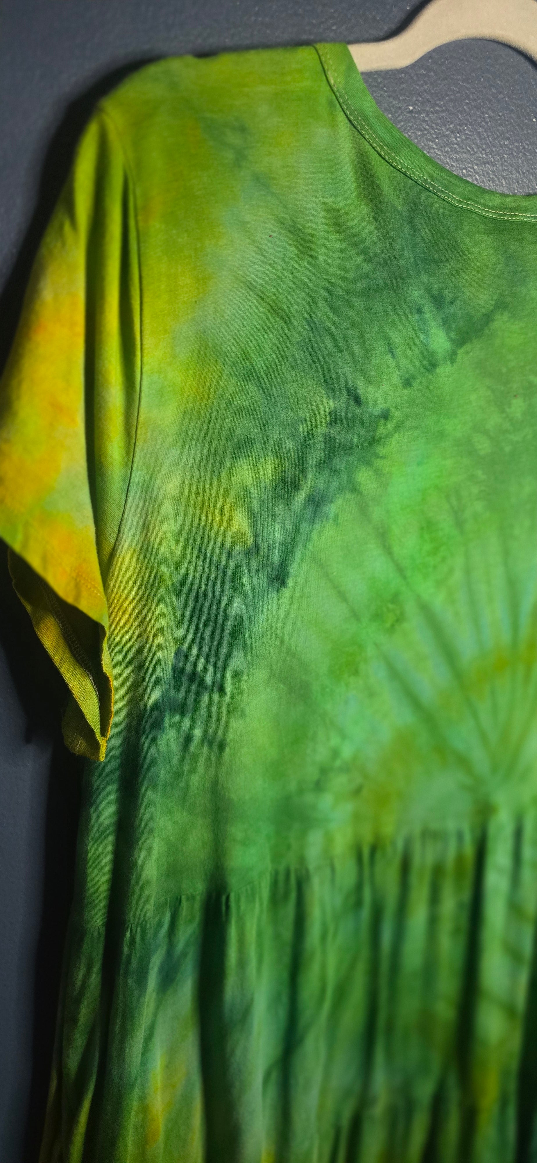 This Time & Tru tiered dress has been fully reborn in lush greens, soft aqua tones, and warm golden sunbursts βοΈπ The spiral detail blooms right across the torso, fading into dreamy watercolor layers.