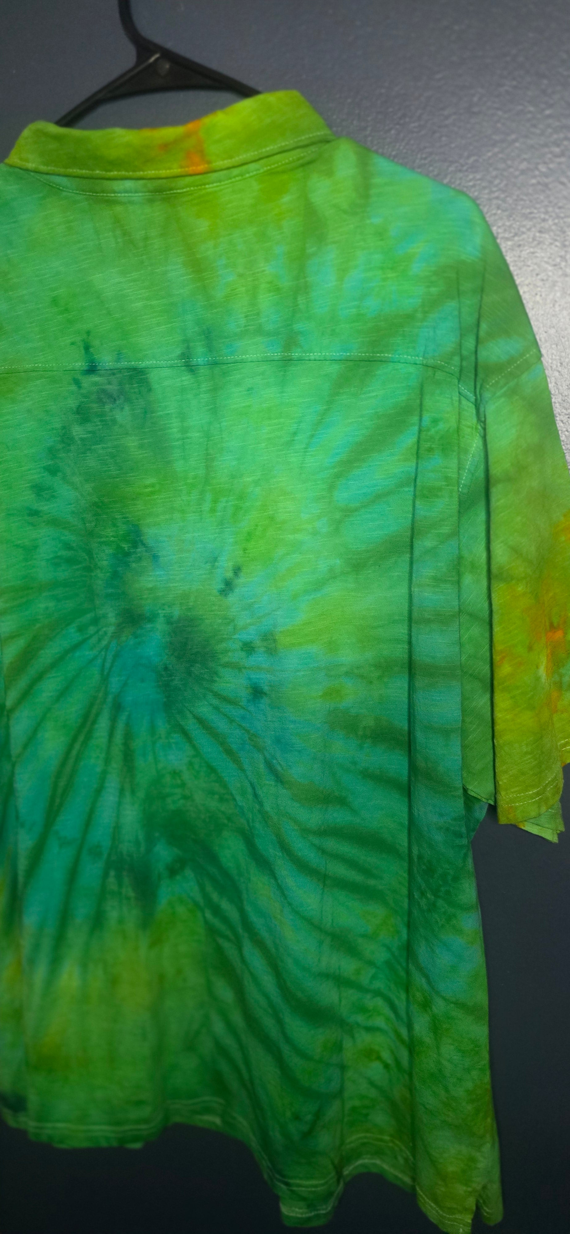 This George short-sleeve button-up is serving full forest energy with a bright, bold spiral dye pattern exploding from the center πΏπ₯π Shades of emerald, lime, aqua, and soft pops of gold blend into a clean, vibrant tie-dye that feels fresh, earthy, and eye-catching.