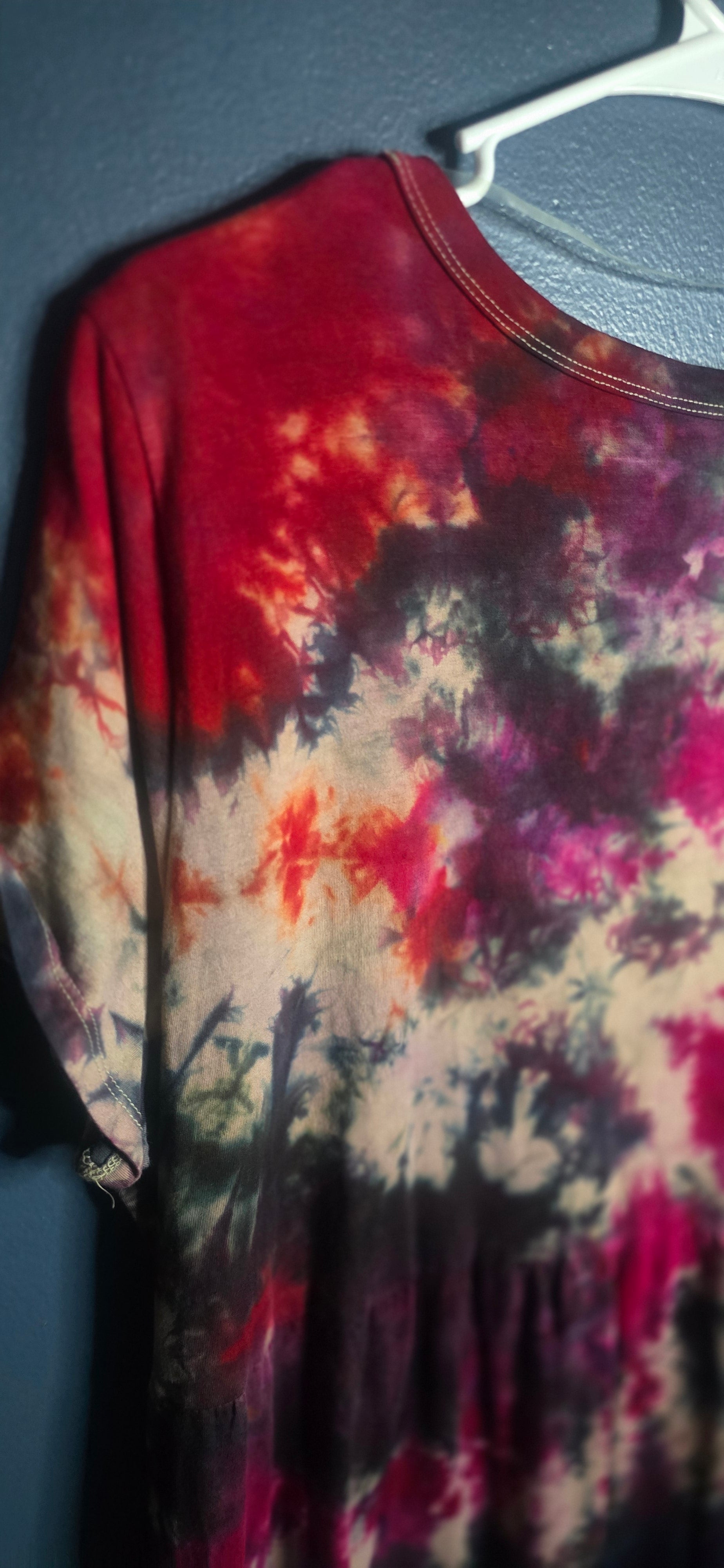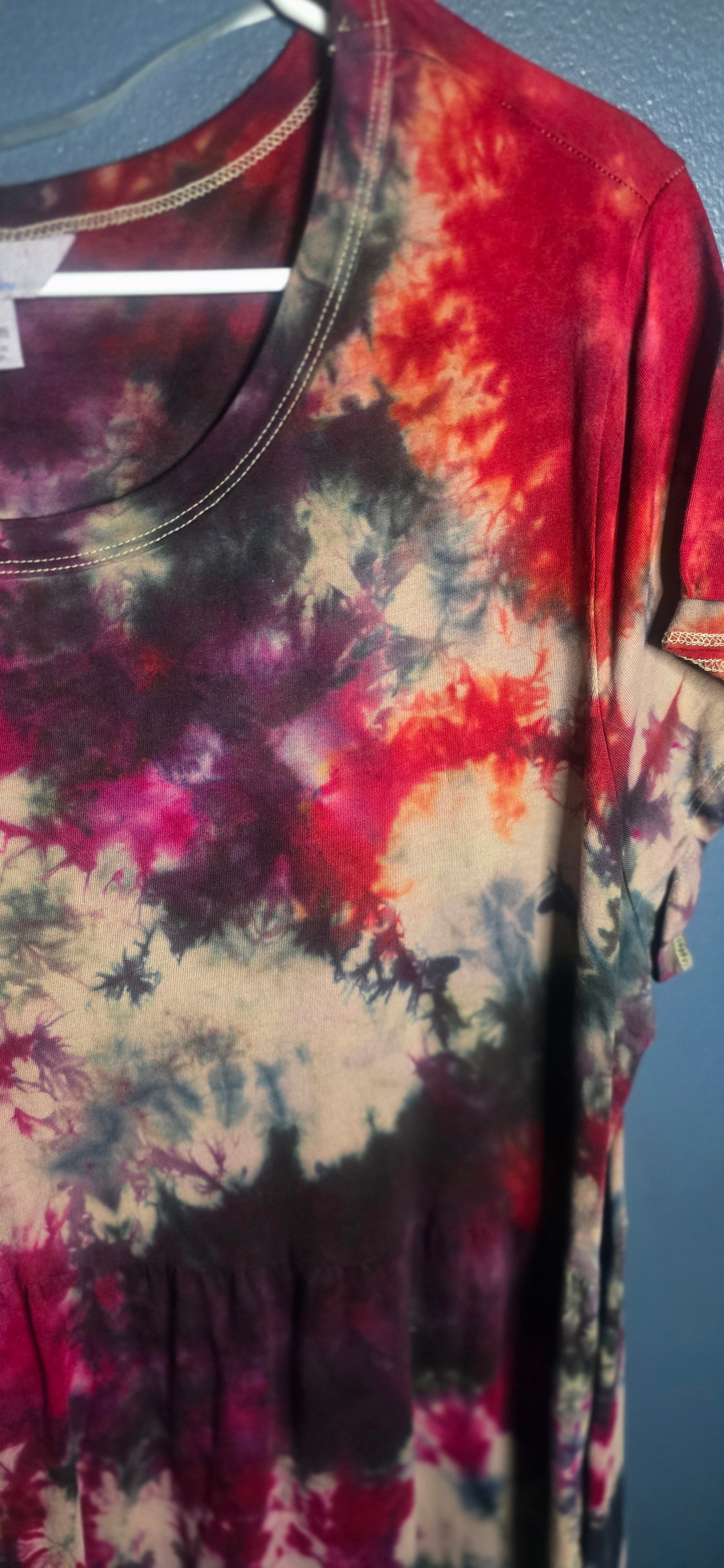 This Time and Tru short sleeve dress features a stunning hand-dyed look in rich shades of burgundy, red, cream, green, and deep purple. Lightweight and comfortable with a relaxed fit that moves easily with you.