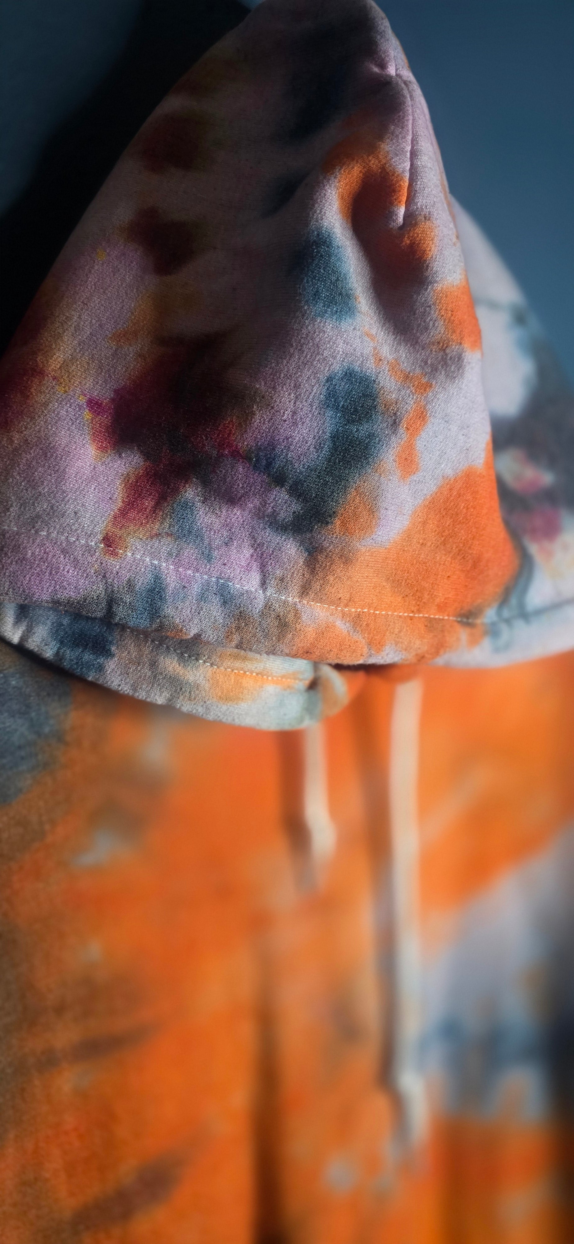 Bold tie-dye pullover hoodie with warm sunset tones of orange, gray, cream, and hints of red 🌈